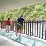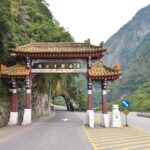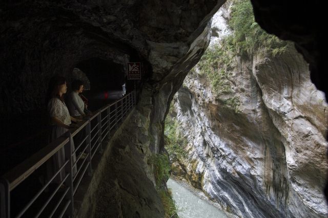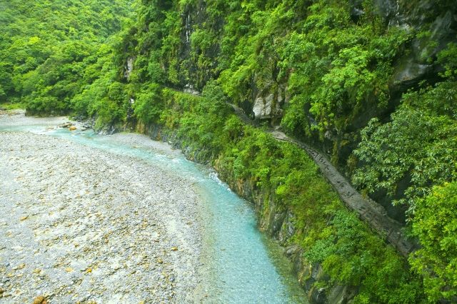 溪谷は真っ赤な中華風の門の「太魯閣牌樓(タイルウグーパイロウ)」から、「天祥(ティエンシャン)」までの約18㎞がおもな観光ルート。「太魯閣牌樓」を入ると、ビジターセンターがあるので地図などを入手しましょう。出発点となる「砂卡礑歩道(シャーカーダンブウダオ)」は、日本統治時代に発電所建設のために作られたもので、崖を削り遊歩道が続いています。大理石の岸壁と澄んだブルーの川のコントラストが美しく、神秘的な雰囲気です。
