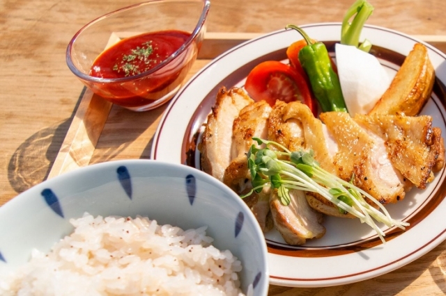 牛肉、豚肉、鶏肉の3種類のメインから好きな料理が選べる「はせくらプレート」。地元食材の利用にこだわったプレートのおかずは、支倉産の米にマッチします。「はせくらプレート」は、地元の農家が作った新鮮な野菜のサラダバーつきです。旬な野菜をたっぷり味わうことができ、大満足。