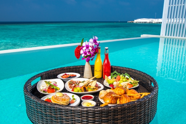 アミラフシでは、朝のひとときを優雅に演出する「フローティング・ブレックファスト」を楽しむことができます。ハムやシリアル、フルーツ、ヨーグルトなどが並ぶ「フローティング・コンチネンタル」と、そこへポーチドエッグやアサイボウルも加えた「フローティング・アミラ」の2種類がスタンバイ。美しく盛り付けられた朝食をトレイに乗せてプライベートプールに浮かべ、ぱしゃぱしゃと遊びながらいただく……なんとも幸せな時間です。