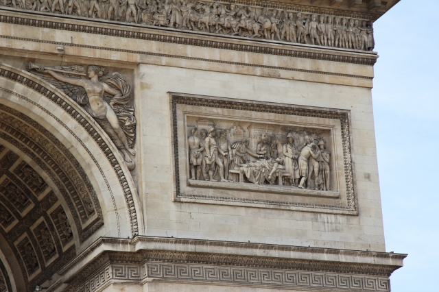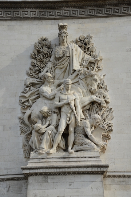 凱旋門に施された彫刻は、シャンゼリゼ大通り側の右下から時計回りで見ていくと、『1792年の義勇軍の出陣』、『1810年の勝利』、『1814年の抵抗』、『1815年の平和』と年代順に並んでいるのがわかります。