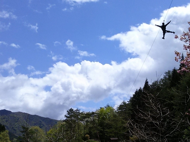 スタッフがお客様にハーネスを装着したら、ハーネスに接続されている道具(金具)をお客様自身で操作します。準備が整い、安全の確認ができたら、木に登り、渡り、滑り降ります。高く危険な場所だからこそ、大人も子供も真剣になり夢中で遊べます。15mの高さから里山に飛び出す137mのジップスライドでは、とびきりのスリルと爽快感を味わえること間違いなしです。
