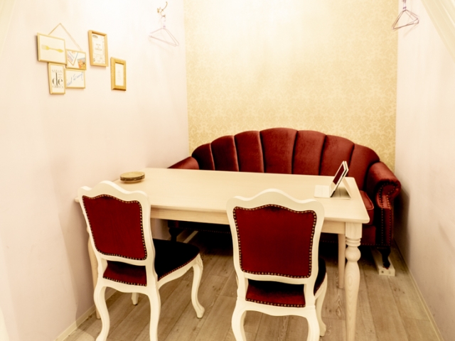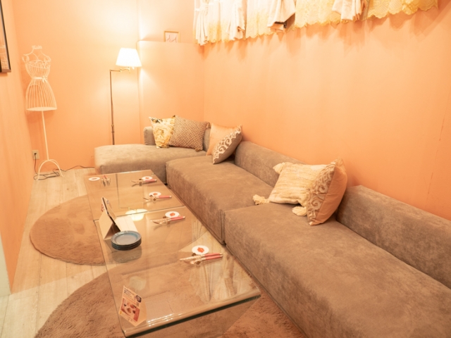 グループでの利用にもOKのプライベート個室は、やわらかなピンク色の空間で、長いソファが印象的。自宅リビングのようにくつろげるプライベート個室は、友人とのガールズトーク、ファミリーやママ友同士のリラックスタイムに最高の空間です。