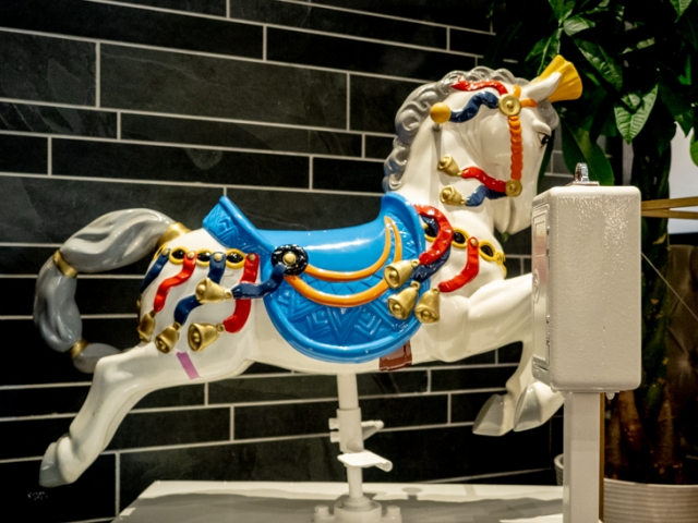 店のあちこちには、フォトジェニックなアイテムが並んでいます。入口には、昔懐かしいコイン式電動の木馬。実際に使われていた木馬で、当時のようにペインティング補修したアンティークものです。