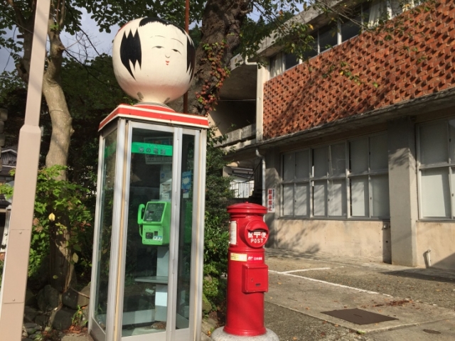 JR鳴子温泉駅を出て、駅前通りを左手にしばらく進んでいくと鳴子総合支所があり、こけしの電話ボックスがあります。