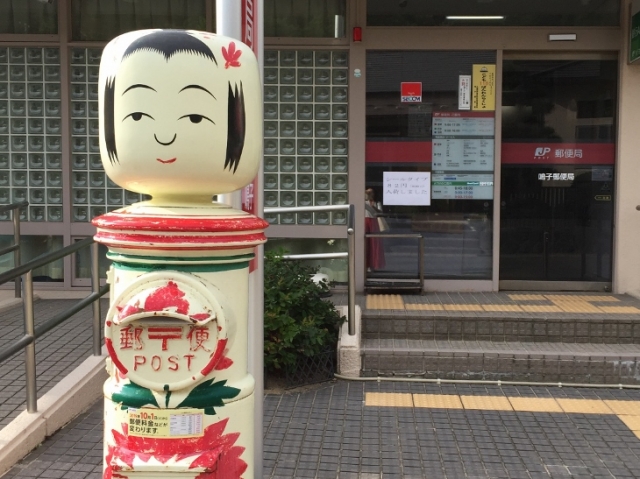 鳴子総合支所から駅方面に戻る途中で、共同浴場「早稲田桟敷湯」への坂を上っていくと、左手に鳴子郵便局があります。こちらには、かわいらしい顔のこけしのポストがあります。