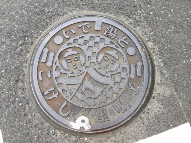 鳴子温泉街のマンホールには、こけしがデザインされています。こちらは、JR鳴子温泉駅前で見つけました。ほかにも、町に溶け込んだいろいろなこけしがありますので、散策しながら探してみてください。