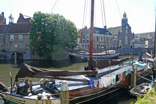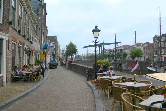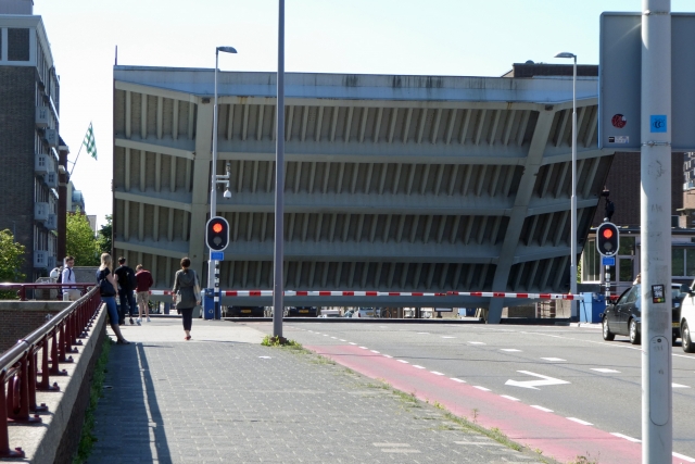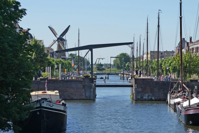 駅から8分ほど歩き、デルフスハーヴェンに入る直前で橋を渡ります。運が良ければ、跳ね橋が上がって船が通行する瞬間に出くわすかもしれません。橋が元に戻るまでには5分くらいかかるので、道を急ぐ地元の人にとってはバッドタイミングですが、滅多にお目にかかれない光景なので、観光客にとってはラッキー(笑)。