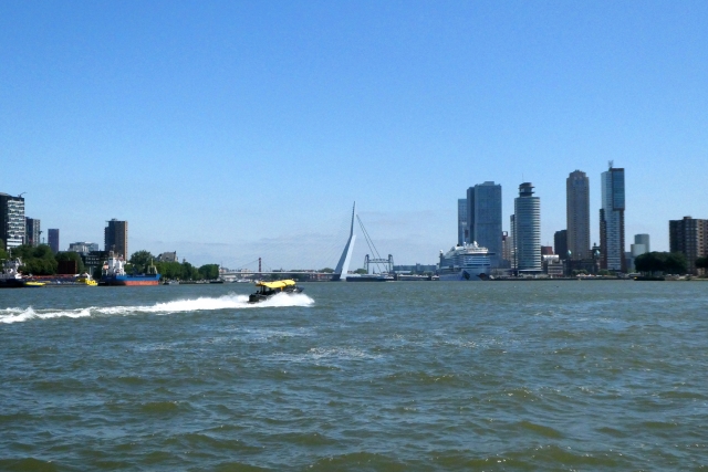 レトロな港町を楽しんだ後は、ヒップな埠頭に移動しましょう。トラムや地下鉄を乗り継いでいく方法もありますが、天気がよければ水上バスがおすすめ。ビアレストランDe Pelgrimからは約20分(1.3キロ)ほど歩きますが(トラムもあり)、St. Jobshavenという船着き場から目的地のKatendrechtまで水上バスが運行されています。約5分と短い船旅ですが、水上からみるロッテルダムのビル群もなかなかのもの。