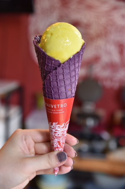 散策に疲れたら、冷たくて甘~いアイスでひと休み! 「タイベトロ・ホームメイド・オールドタウン」はタラン・ロード付近にある、地元の人や観光客に人気のアイスクリームショップです。店内は30種類以上のアイスクリームが並び、タイらしいトムヤム・クン(!)やタイティーなど、タイならではのフレーバーも! 店内で焼いているというコーンはローズやココナッツなど9種類あり、アイスもコーンもカラフルなので、SNS映えを狙った組み合わせをチョイスして!