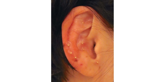 ビューティサロンでは、ちょっとおしゃれな「鍼」の施術はいかが? サロン「ヴィア・ヒーリング」で体験できるメニューで、耳たぶのツボに数本の鍼をうって体の不調を整えるのですが、その鍼が、まるでピアスのような金の粒でファッショナブル! 痛みはなく、鍼は数日で自然に剥がれるという点も安心です。