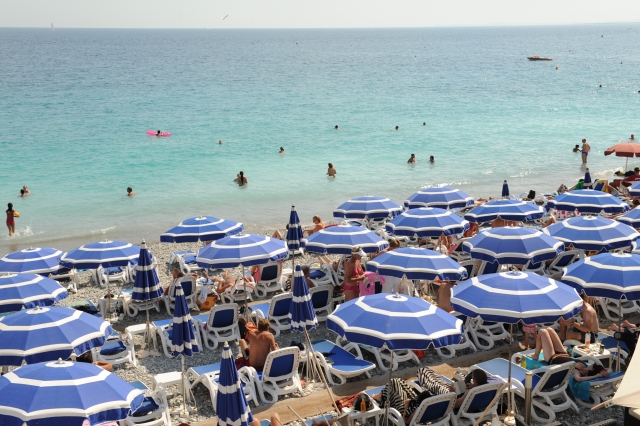 ニースのビーチは、ホテルなどが運営する15のプライベートビーチと誰でも利用できるパブリックビーチに分かれています。パブリックビーチは無料で自由に入ることができますが、プライベートビーチは有料です。たとえばカステルビーチ(Plage Castel)は1日の利用料が€20。パラソル使用料は€5。ニースは石浜なので、長時間寝そべっていると、体が痛くなることも。ゆったりと快適に過ごしたいなら、デッキチェアのあるプライベートビーチを利用するといいでしょう。