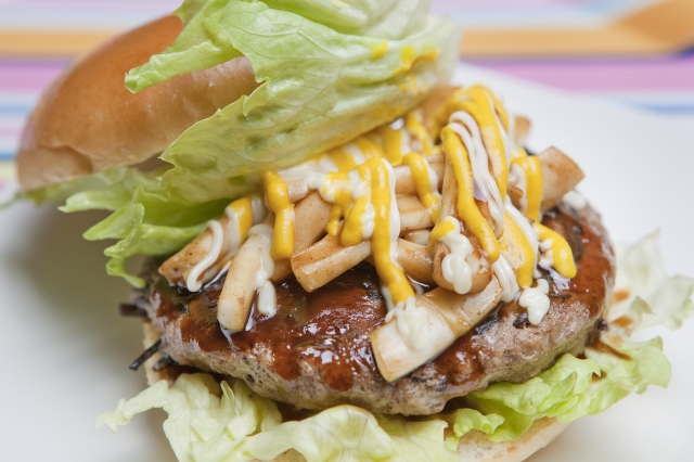 対馬バーガーは、イカとひじきを使った対馬のご当地バーガーです。対馬産のひじきを練り込んだパテの上に、刺身でも食べられるほど新鮮なイカをバターとしょうゆで味付けをし、鉄板で焼いたものを乗せています。
