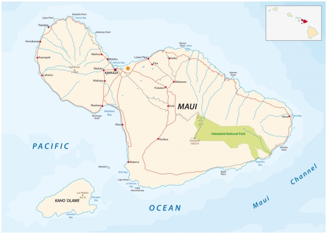 オアフ島から南東へ118キロメートル。北緯20度35分から21度02分、西経155度59分から156度42分に位置する、ハワイ諸島ではハワイ島に次いで2番目に大きい島です。面積は1883.5平方キロメートルで、大阪府とほぼ同じ大きさです。島はひょうたん型をしていますが、もともとはふたつの島で、火山活動の結果、流れ出した溶岩が2島を結びつけて今日の地形になっています。