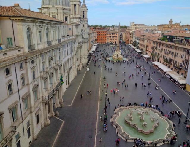 かつて、ナヴォーナ広場では広場に水を張り、模擬海戦などが行われました。そのような歴史をもつナヴォーナ広場全体の写真を撮ることができる場所を紹介しましょう。