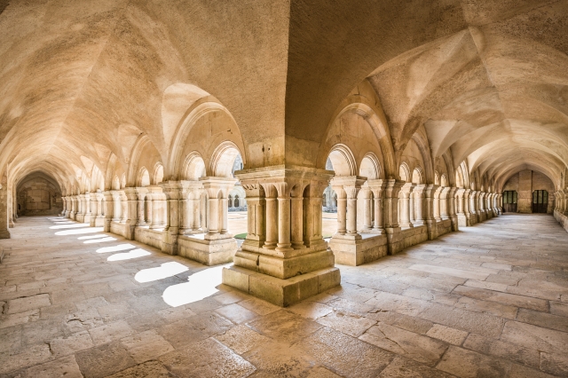 1118年に建てられたフォントネー修道院は、現存する最も古いシトー会修道院です。「シトー会」というのは、ブルゴーニュ出身の青年修道士ベルナールが創設した修道会で、華美な生活を送るクリュニー会への反発から1098年に発足しました。清貧・質素を信条に、祈りと労働を守る生活を送る会派で、修道院の建物も、装飾が排除された簡素な造りになっています。フランス革命後に製紙工場となった時代もありましたが、その後修復が進められ、現在は創建当時の姿を取り戻しました。1981年に世界遺産に登録されています。