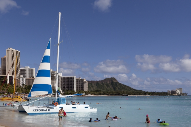 大型クルーズ船よりリーズナブルで、1.5~2時間のショートクルーズを気軽に楽しめるのがカタマランクルーズ。2隻のボートを並べたような双胴船のヨットなので揺れが少なく、船酔いの心配が少ないことも特徴です。ワイキキビーチからは数隻のカタマランが出航していて、定員に空きがあればその場で申し込んで乗船できます。ただし、サンセットに合わせて出航するクルーズは人気が高いため事前の予約がおすすめ。海から眺めるワイキキビーチの景色もまた格別ですよ。