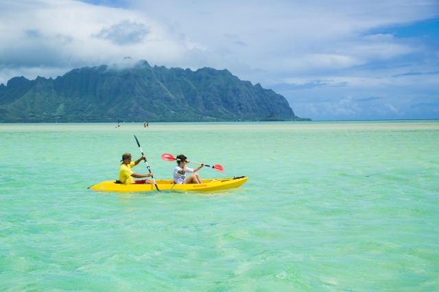 オアフ島の東海岸、カネオヘ湾の沖合に、潮の満ち引きによって現れる砂洲が「天国の海」の別名を持つサンドバー。エメラルドグリーンの海に白く浮かんで見える様子があまりにも美しいため、この名が付きました。カネオヘ湾から出航するボートツアーがいくつか出ていて、砂洲の上を歩いたり、シュノーケリングでは砂洲の周りのリーフに集まってくる熱帯魚と戯れたり、ウミガメに出合うことも。カヌーやSUPなども楽しめます。
