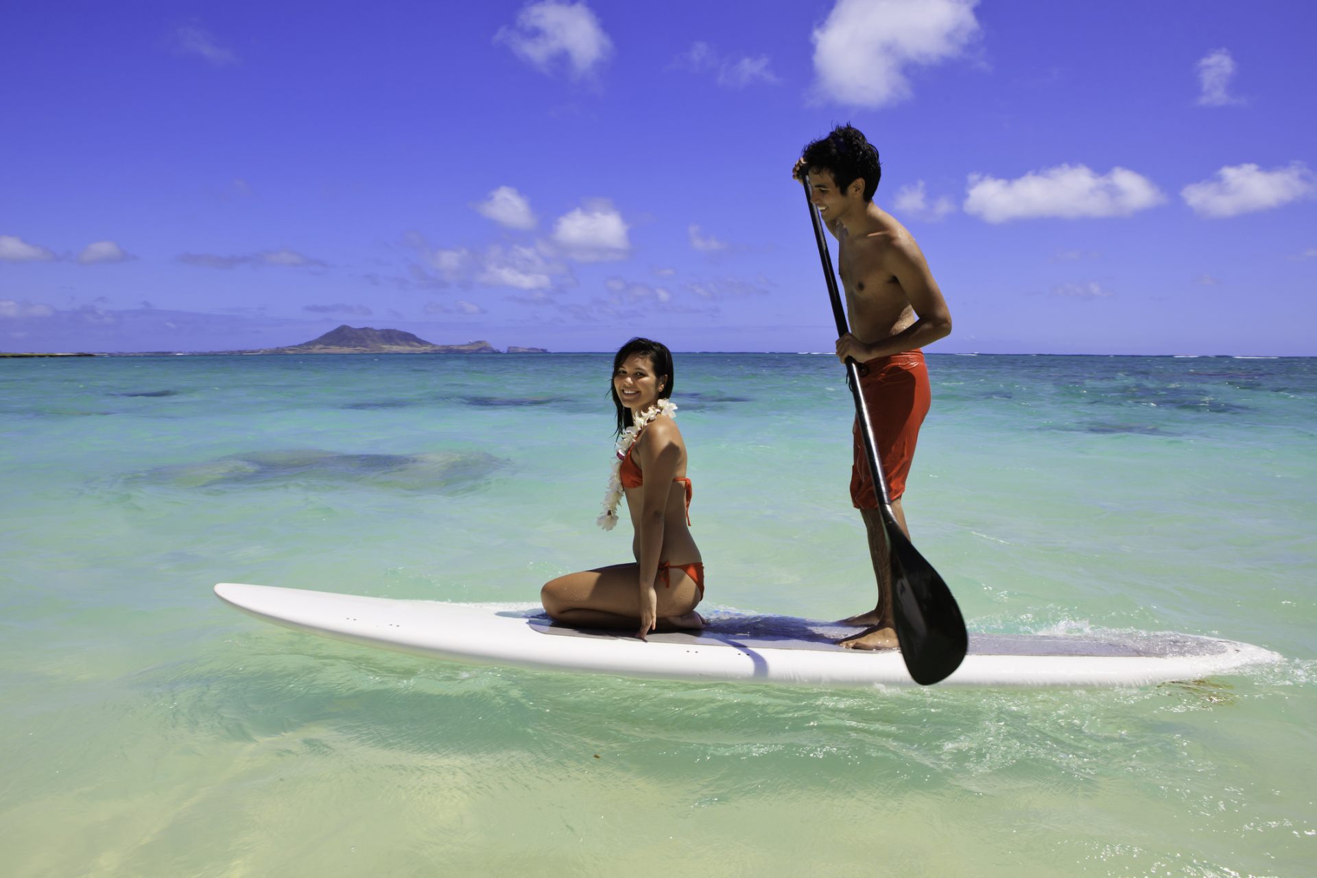 サーフィンより簡単で、初めてでも1時間のレッスンでほぼ確実に乗れるようになるのが、パドルサーフィンとも呼ばれているSUPです。パドルを使うのでサーフィンよりコントロールしやすく、脚力に自信がない女性でも気軽にトライできるのが魅力です。