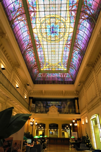町なかのアールヌーヴォースポットでぜひ見てほしいのが、スタニスラス広場から徒歩3分のサン・ジョルジュ通りに建つ「クレディ・リヨネ銀行」。1901年フェリシアン・セザール設計の建物ですが、なんといっても天井のステンドグラスが見事! ガレやドーム兄弟とも仕事をした人気ステンドグラス作家ジャック・グリュベールJacques Gruber(1870〜1936年)作の巨大なステンドグラスが天窓として使われています。