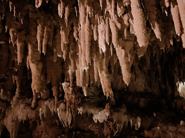 一つひとつの鍾乳石の真ん中に、極細ストローのような水の通り道があるそうです! ここから少しずつ、地下水が石灰岩を溶かしたものが染み出し、徐々につららのような石ができあがってくるんですって。下に落ちたつらら石も少しずつ積み重なり、上に向かって伸びるように。これは「石筍(せきじゅん)」と呼ばれ、やがて天然の「柱」へと成長するそうですよ!