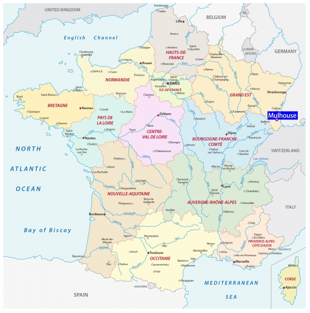 フランス東部、ドイツとスイスの国境近くに位置するミュールーズは、パリから鉄道で約2時間40分。空港もあり飛行機だと約1時間の距離です。昔から水のきれいな川が流れていたことから「水車小屋」を意味するMulhouse(ミュールーズ)と名付けられました。