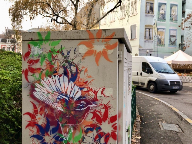 ウォールアートの家のすぐそばで、パリ在住のフランス人アーティストSTEWの作品を発見! 日本にも影響を受けているというSTEWは、鳥と花をカラフルに組み合わせたグラフィックアートが人気。町によくあるスチールボックスの側面に描かれているので、気づかず通り過ぎてしまいそう。見つけられると嬉しさ倍増です。