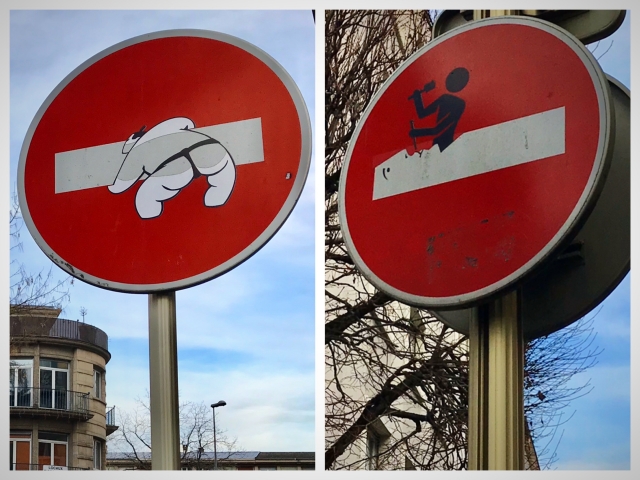 ユニークな道路標識アートは、フィレンツェ在住のフランス人アーティストClet Abrahamの作品。なんとミュールーズに200ヵ所近くもあるのだとか!