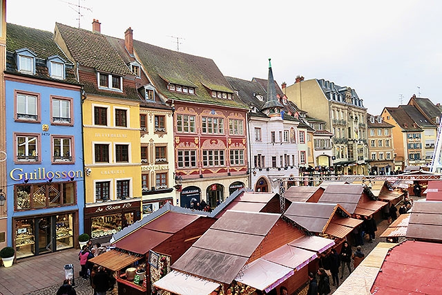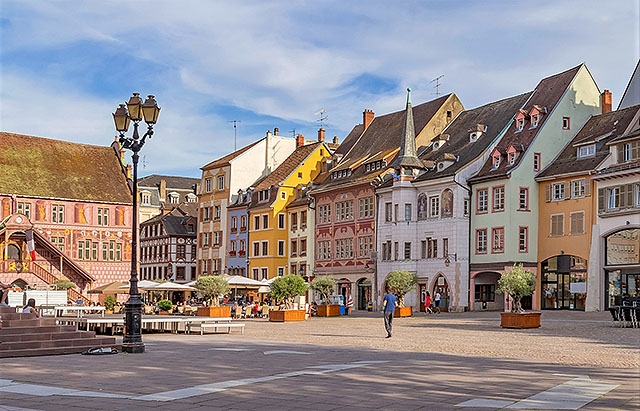 ミュールーズの中心部は歴史地区と呼ばれ、工業都市のイメージからはかけ離れたメルヘンな佇まい。歴史地区のレユニオン広場にはピンクの旧市庁舎やパステルな建物が並び、おとぎの世界のようなかわいさです。
