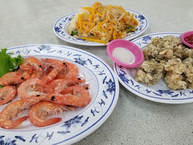 旗津半島で海鮮を食べるならこちら。フェリー乗り場からタクシーで約15分、自転車で約30分の海鮮料理店です。店頭の生簀にはエビやカニがたくさん。店長のおすすめは、蒸しエビ、牡蠣のフライ、カボチャのビーフン炒め。3人以上で訪問したら、タラバガニ粥の螃蟹粥(パンシエヂョウ)もおすすめです。メニューがないので少しハードルが高く感じるかもしれませんが、食べたい魚は店頭で指差し注文できますし、親切なスタッフが対応してくれるので安心です。