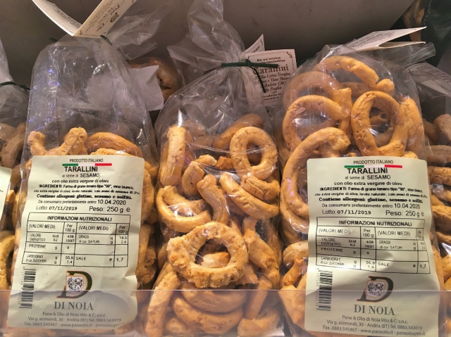 味は若干の塩気があって、小腹が空いた時のスナックとして食べられています。ペルージャの青空市場(11月1日の諸聖人の祝日=死者の日にピアン・ディ・マッシアーノ Pian di Massiano 広場で開催)では、オリーブの実を混ぜたものやペペロンチーノ(唐辛子)味、ゴマ味、ローズマリー味、ピザ味、フェンネル味などのフレーバーが€1.5(100g)から購入できました。もちろん、イタリア各地の青空市場でもタラッリを見つけることができるでしょう。