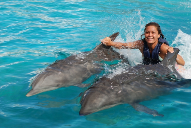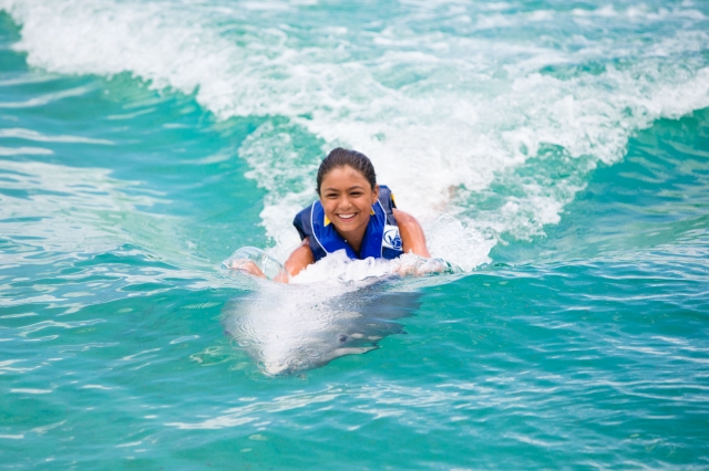 「ドルフィン・ロイヤル・スイムはちょっと不安……」という人には、こちらのプログラムがおすすめ。イルカとキスしたり、一緒にぷかぷか浮かんだり、おなかをくっ付けて泳ぐ「ベリーライド」で遊びます。$10のクーポン券とベリーライド中の写真付き。