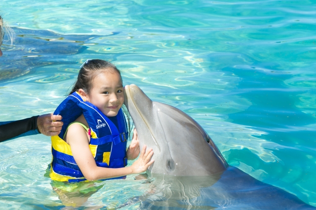 園内のバックステージプールで体験するプログラム。イルカに触れたり、餌付けをし、さまざまな行動を観察します。水に入らないので水着に着替える必要がなく、比較的時間が短いため、小さな子ども連れのファミリーにおすすめのプログラム。体力が不安な人や妊娠している女性、体が不自由な人も楽しめます。