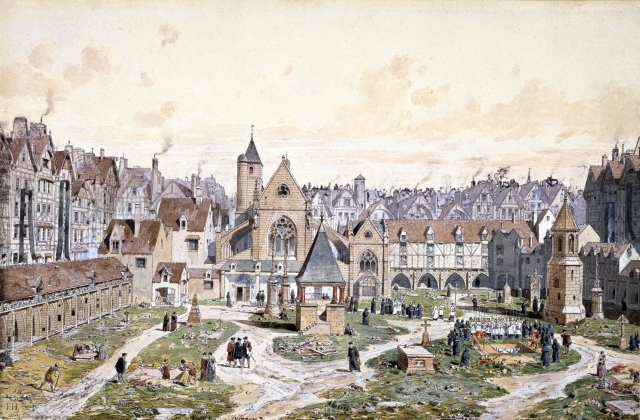 サン・イノサン墓地は、閉鎖されるまで10世紀にわたり使われた墓地です。パリが発展していくと、サン・イノサン墓地に埋葬される無縁仏の数は多くなり、周囲も都市化。フランスの埋葬方式は土葬のため、遺体が自然分解するスピードより埋葬する頻度と量が勝れば、墓地は供給過多に陥ります。墓地に次々と遺体は運び込まれますが、遺体は土の中で分解せず、墓地は異臭を放つようになりました。また度重なる埋葬で、墓地の高さが周囲の通りより随分高くなっていたそうです。疫病の流行や地下水汚染なども生じました。