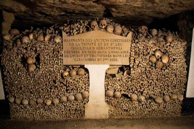 壁に沿って遺骨を積み上げられた坑内には、各所に「どこの墓地にあった骨で、いつここに運び込まれたか」が石板に表示されています。もちろんサン・イノサン墓地の表示もあります。