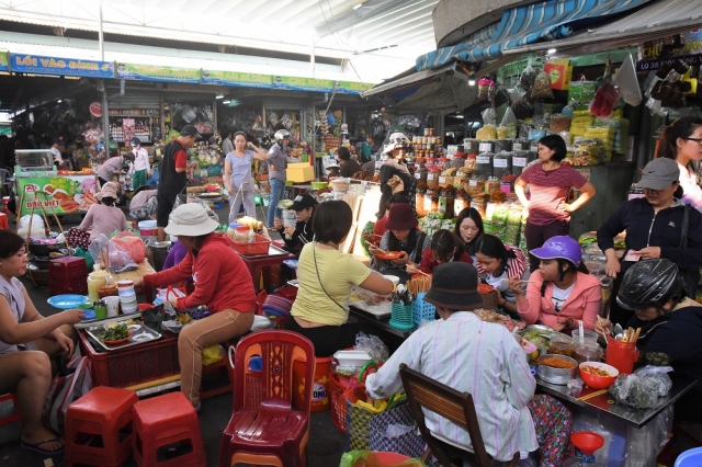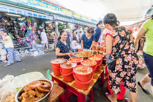 観光客の姿も多いハン市場に比べ、コン市場はさらにローカル色の強いダナン市民の台所。半屋外の巨大な市場に、雪崩が起きそうな高さに積まれた食料品や衣料品が目を引きます。食事時にはどこからともなくテーブルや椅子が道の真ん中に並べられ、その横をバイクがすれすれで走り去る光景は見ているこちらがヒヤヒヤしてしまいます。商品に値札は付いていないので、買い物には値段交渉が必要ですが、土産物店より安い価格で買える可能性も。