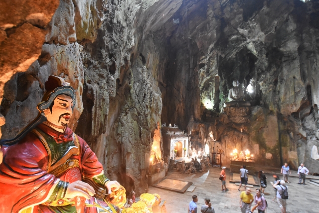 山中には仏像が安置された寺院や洞窟が点在し、聖なる山として人々の信仰を集めています。なかでも観光の中心となるのが、最も大きいトゥイーソン(水山)。急勾配の石段を頂上まで上ると、平地にそびえるほかの4つの山やダナンの町並み、紺碧の海を見渡せます。さらに順路を進むと、アメリカ軍の爆撃により天井に穴が開いたフィエン・コン洞窟に到着。穴から洞窟内に差し込む光は神々しく、五行山が霊験あらたかな山々であることをあらためて感じることができます。