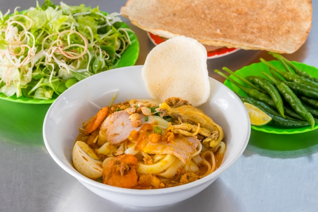 ベトナムといえば米粉を使った汁麺フォーが有名ですが、地方によってフォーよりもよく食べられるご当地麺があります。中部ダナンでは、きしめんのような平打ち麺に肉やエビ、ピーナッツなどを合わせた汁なし麺ミー・クアンが名物。ダナンにはミー・クアン専門店がいくつもありますが、なかでも1、2を争う人気店がミー・クアンAです。