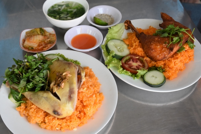 ダナン名物のチキンライス、コム・ガー専門店。鶏肉を高温で揚げたコム・ガー・クアイCơm Gà Quay(5万2000ドン)は、カリッとした皮と染み出る肉汁を楽しめる人気No.1メニュー。鶏肉を茹でたコム・ガー・ルオックCơm gà Luộc(6万5000ドン)はしっとり軟らかな食感が魅力です。付け合わせは、野菜のだしが効いた優しい味わいのスープとキムチ。卓上に置かれた唐辛子とチリソース、ヌックマムで自分好みの味にカスタマイズするのがベトナムスタイルです。