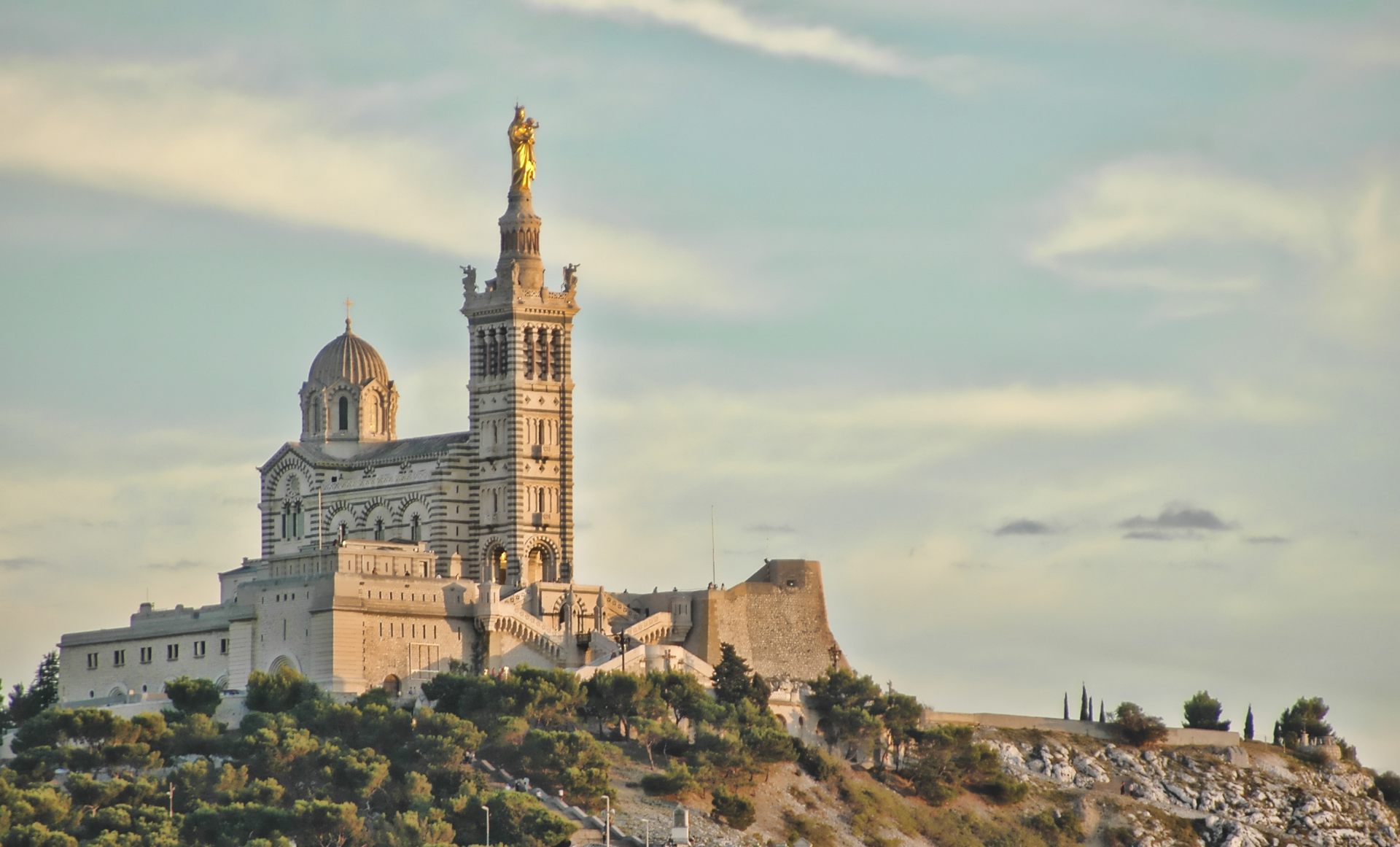 旧港を中心に見所が点在しており、旧港から南へ高台を登っていった先にノートルダム・ド・ラ・ギャルド・バジリカ聖堂が鎮座しています。ロマネスク・ビサンチン様式の建物で、聖堂からはマルセイユ市内や地中海のパノラマを楽しめます。