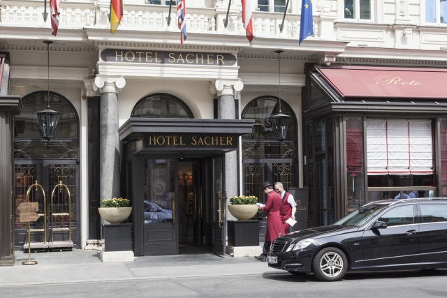 フランツ・ザッハーの息子が開業したホテル内のカフェ。店内は赤と金のザッハ―カラーで統一。創業当時のレシピで作るザッハ―トルテは無糖のホイップクリームを添えて提供されます。