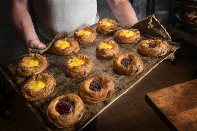薄く引き延ばしたパン生地にたっぷりのバターを何層にも織り込み、トッピングとしてチョコレートやフルーツジャムをのせて焼き上げる菓子パンです。デンマークの定番として知られますが、現地では「ヴィナーブロード(ウィーンのパン)」と呼ばれています。一説によると、オーストリアのウィーンが発祥で、その後デンマーク国内全体に広まっていったといわれます。