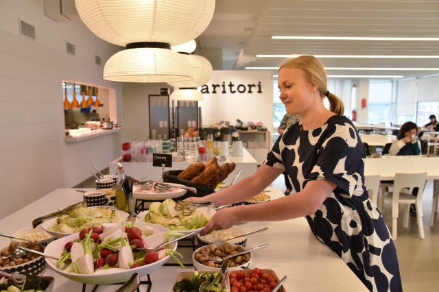 ヘルシンキの中心部から地下鉄で15分ほどのところに、マリメッコの本社があります。ショップやアウトレットが併設されているほか、社員食堂も利用できます。食堂は、ファブリックや食器にいたるまで100%マリメッコの夢空間! 料理だって本格的なのに、値段は良心的なんです。