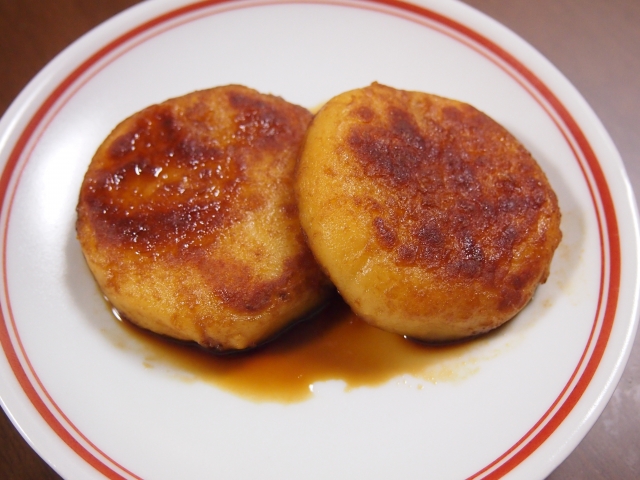 「いもだんご」は日本一のジャガイモの生産地、北海道の郷土料理。すりおろしたジャガイモにデンプンを混ぜてフライパンで焼き、甘辛のタレをからめたものです。デンプンもジャガイモから作られるんですよ。