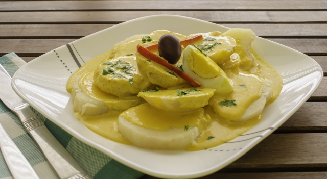 クリームやチーズ、アヒ・アマリージョという黄色いトウガラシのペーストなどを加えたソースを、ゆでたジャガイモの上にたっぷり。ゆで卵とオリーブを添えるのが一般的です。
