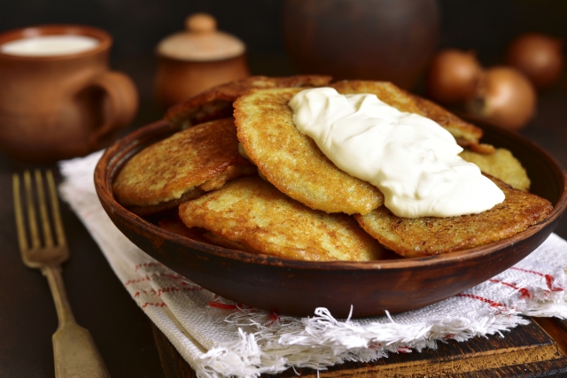 すりおろしたジャガイモに小麦粉、卵、挽肉、タマネギのみじん切り、ニンニク、サワークリームなどを混ぜ、フライパンで両面をこんがり焼いたものです。