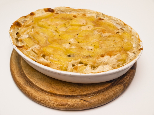 作り方は、細切りにしたジャガイモとタマネギ、アンチョビを交互に重ね、生クリームや牛乳をかけ、バターをのせてオーブンでじっくり焼き上げます。