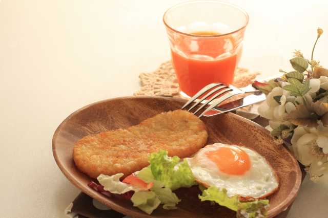 細切りにしたジャガイモを成形して揚げた、アメリカの朝食の定番。アメリカではハッシュブラウン、日本ではハッシュポテトとも呼ばれます。