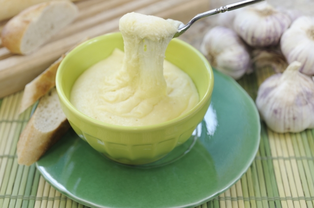 牛乳やバターを加えてなめらかなピュレ状にしたジャガイモに、ニンニクのみじん切り、トムチーズを入れてじっくり練り上げて作ります。