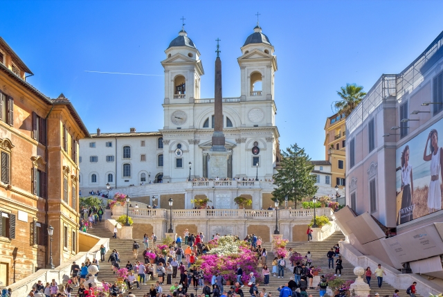 ベルニーニ作の舟の噴水がある広場。ここからトリニタ・デイ・モンティ教会まで続くのがスペイン階段で、オードリー・ヘップバーン不朽の名作、『ローマの休日』においてアン王女とジョーがデートで訪れた場所がここです。