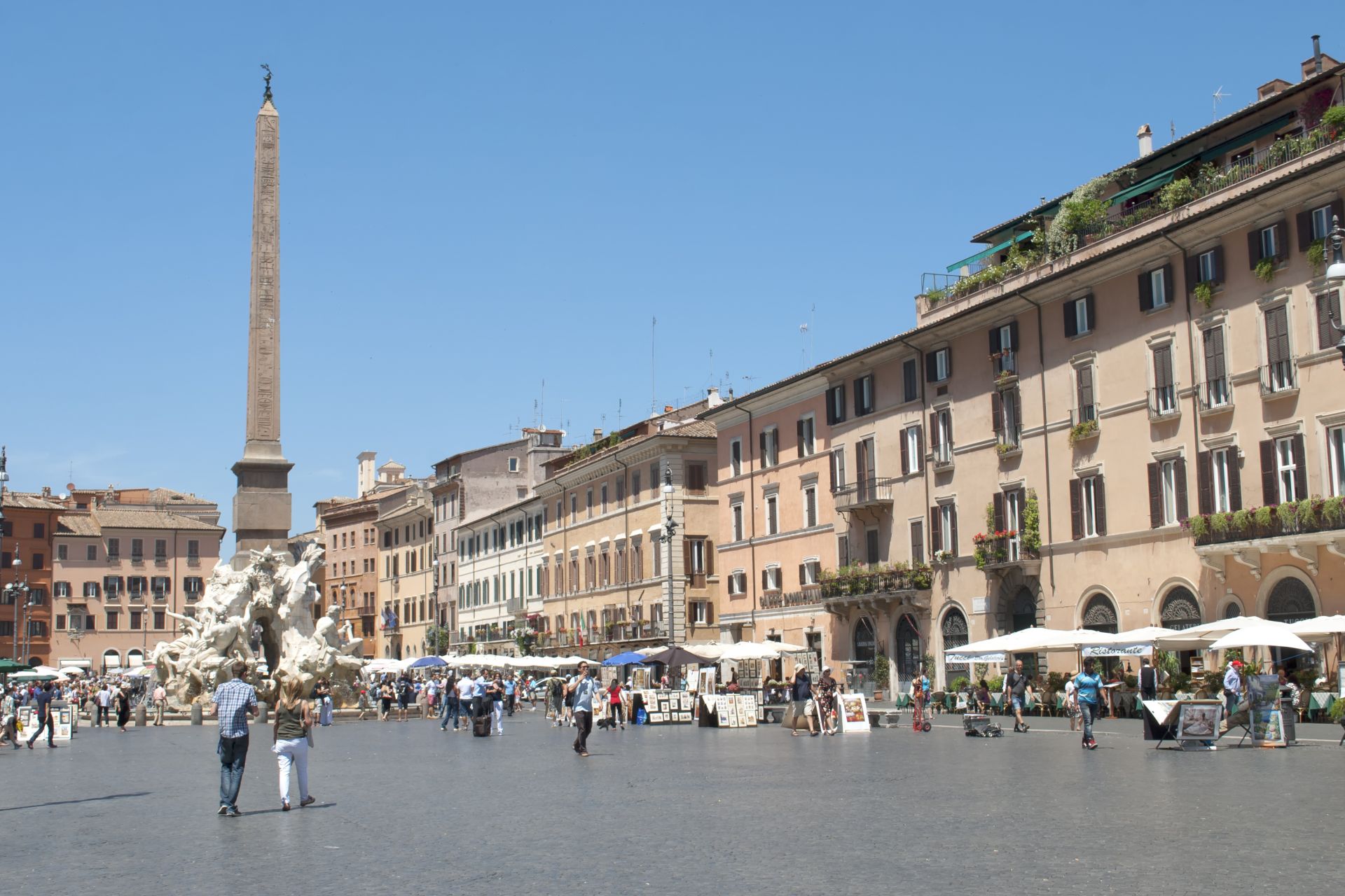 古代ローマ時代に造られた広場。南北約275m、東西約106mと細長い形をしていますが、これは最初に戦車の競技場として造られたため。